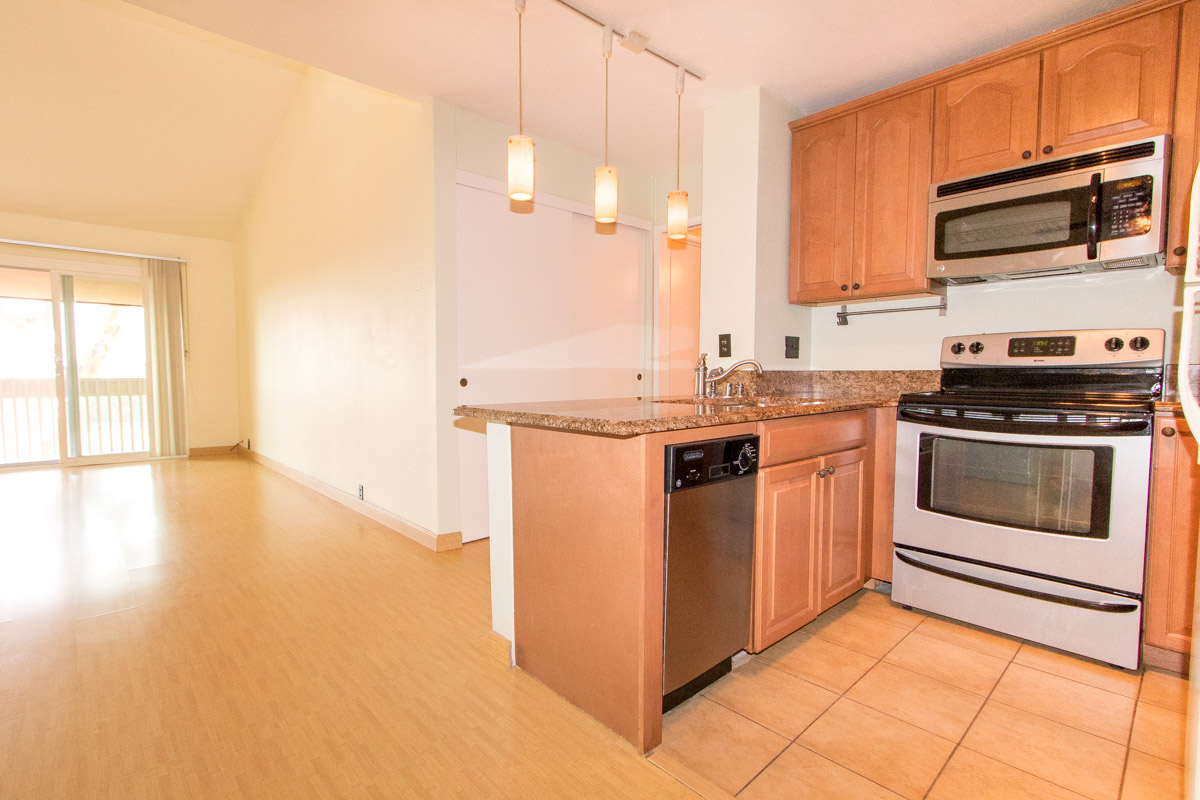 Located on the 3rd floor facing the tennis courts with Mission Bay in the background, this is a premier location in the complex. This floor plan known as the “penthouse” has vaulted ceilings, beautiful new vinyl flooring that will last decades, new paint, granite counter tops in kitchen, ample closet space, and a loft in bedroom with stairs leading up to extra storage or creative use of space. Additionally, it has a private balcony, south facing skylights, pendant lighting and newly renovated bathroom.
