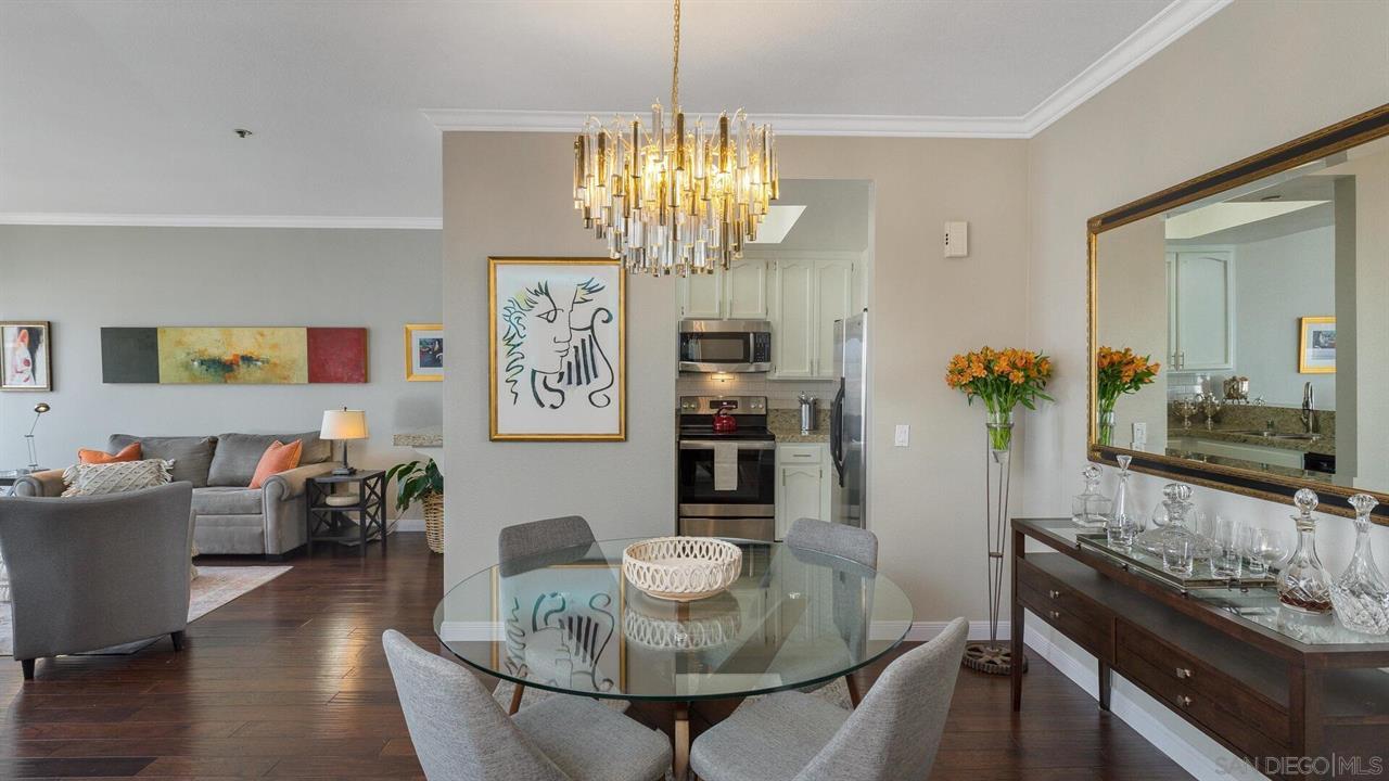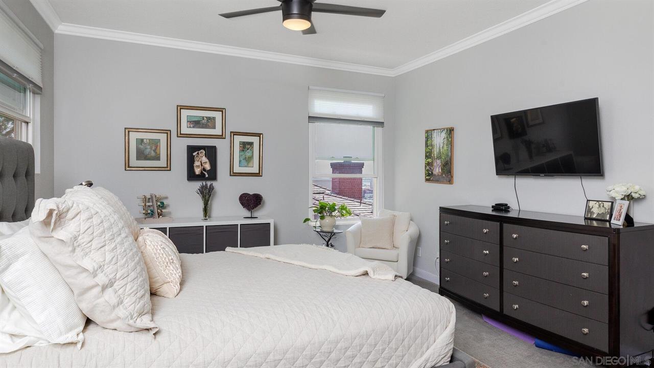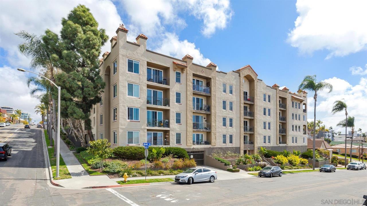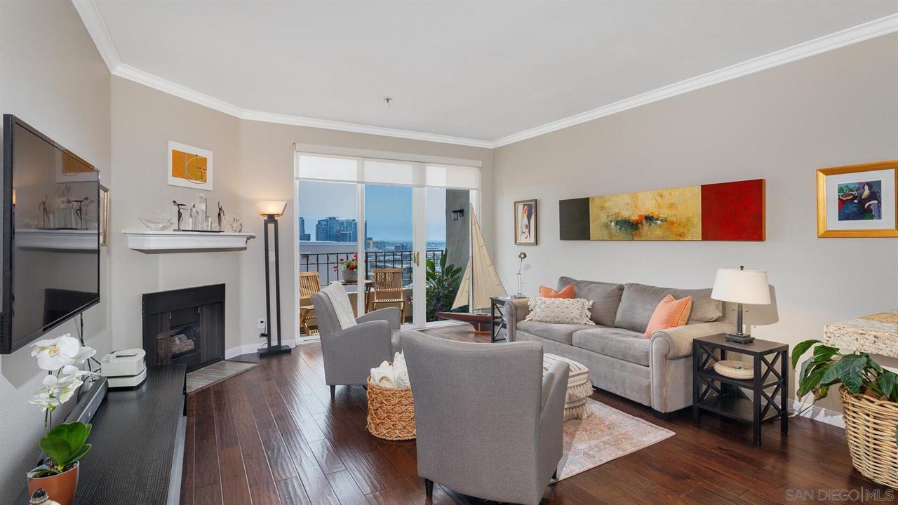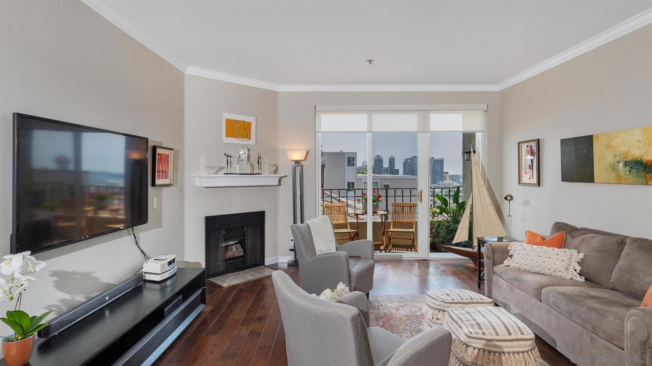 Stylish & upgraded in sought after Bankers Hill...rarely available top floor unit w/ views of the city, harbor, ocean, & Point Loma. Open floorplan featuring 9 ft ceilings, hardwood flooring, new baseboards & crown molding, cozy fireplace & redone, private balcony - all new waterproofing/texturing of floor. Gorgeous kitchen featuring SS appliances, refinished/painted cabinets, granite counters, subway tile backsplash, new fixtures/hardware, & bar seating. Both bathrooms recently remodeled, custom paint & cellular black out shades throughout, tranquil & spacious bedrooms w/ both greenery and city/water views. Full size, in-unit laundry plus multiple storage sheds. Complex features pool, hot tub, bbq area and exercise room.