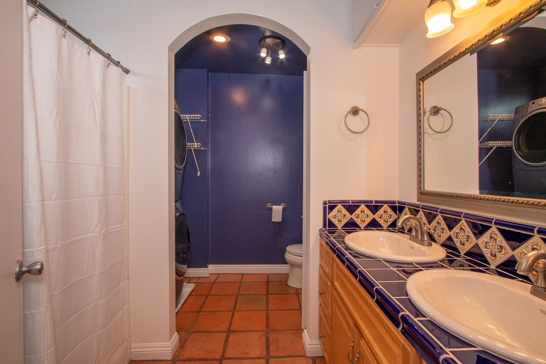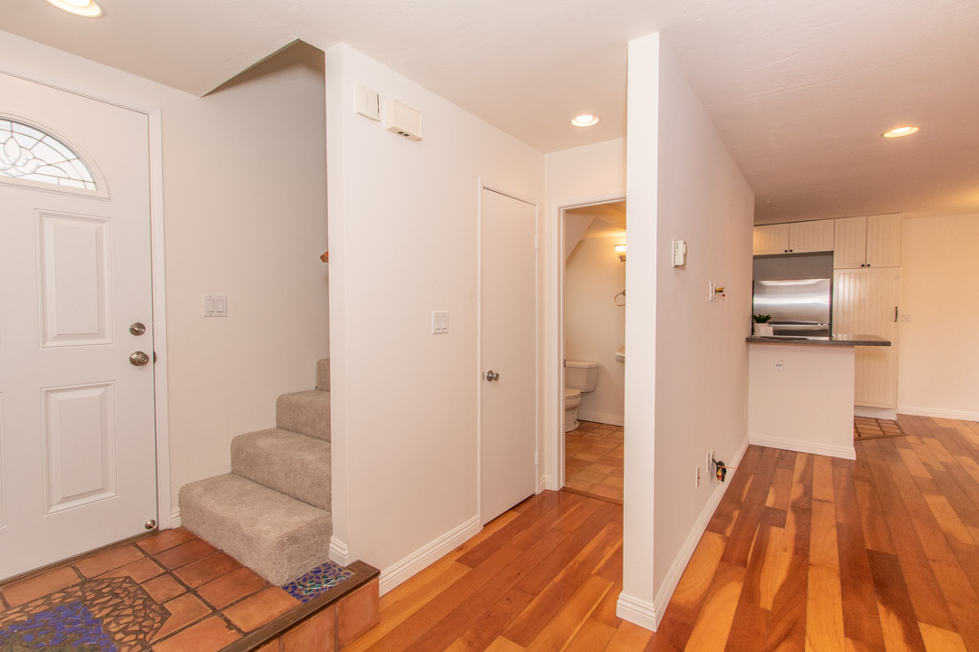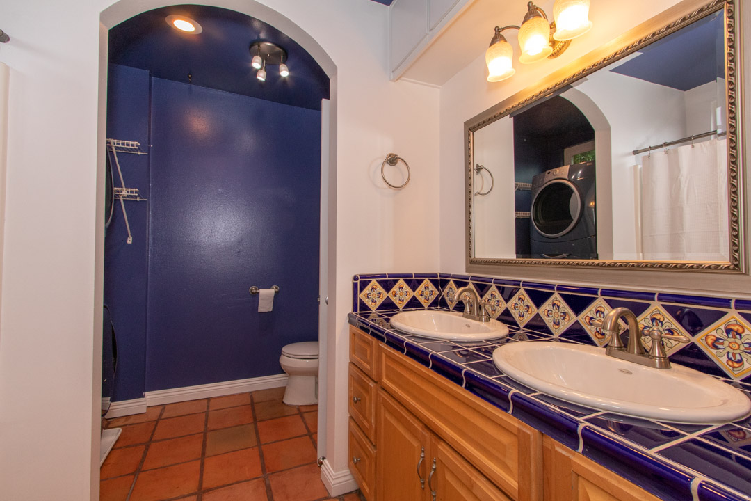 With so many desirable features, this home is a must see! Terracotta tiling with custom details, accent paint and beautiful natural wood flooring. Open concept main living and kitchen area that spans out to two private patios. Kitchen boasts updated counter tops and custom cabinetry, along with stainless steel appliances, built in microwave, gas stove, dishwasher and refrigerator. Large first floor half bath with custom shelving, pedestal sink and designer lighting. Second story includes a generous master bedroom that opens up to a Jack and Jill bathroom, with terracotta flooring and custom tiled double sinks. Energy efficient full sized washer and dryer and four off street parking spots!