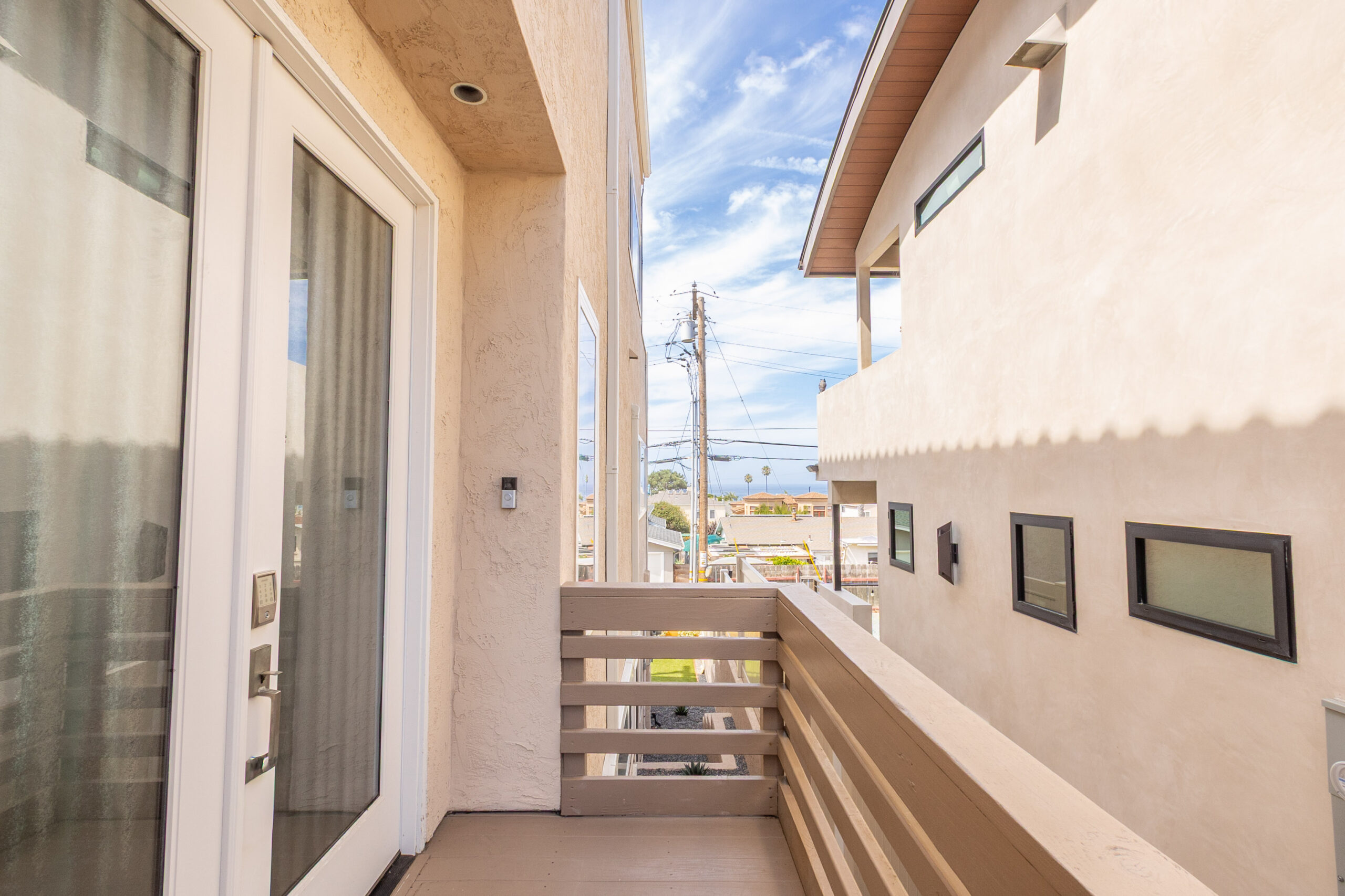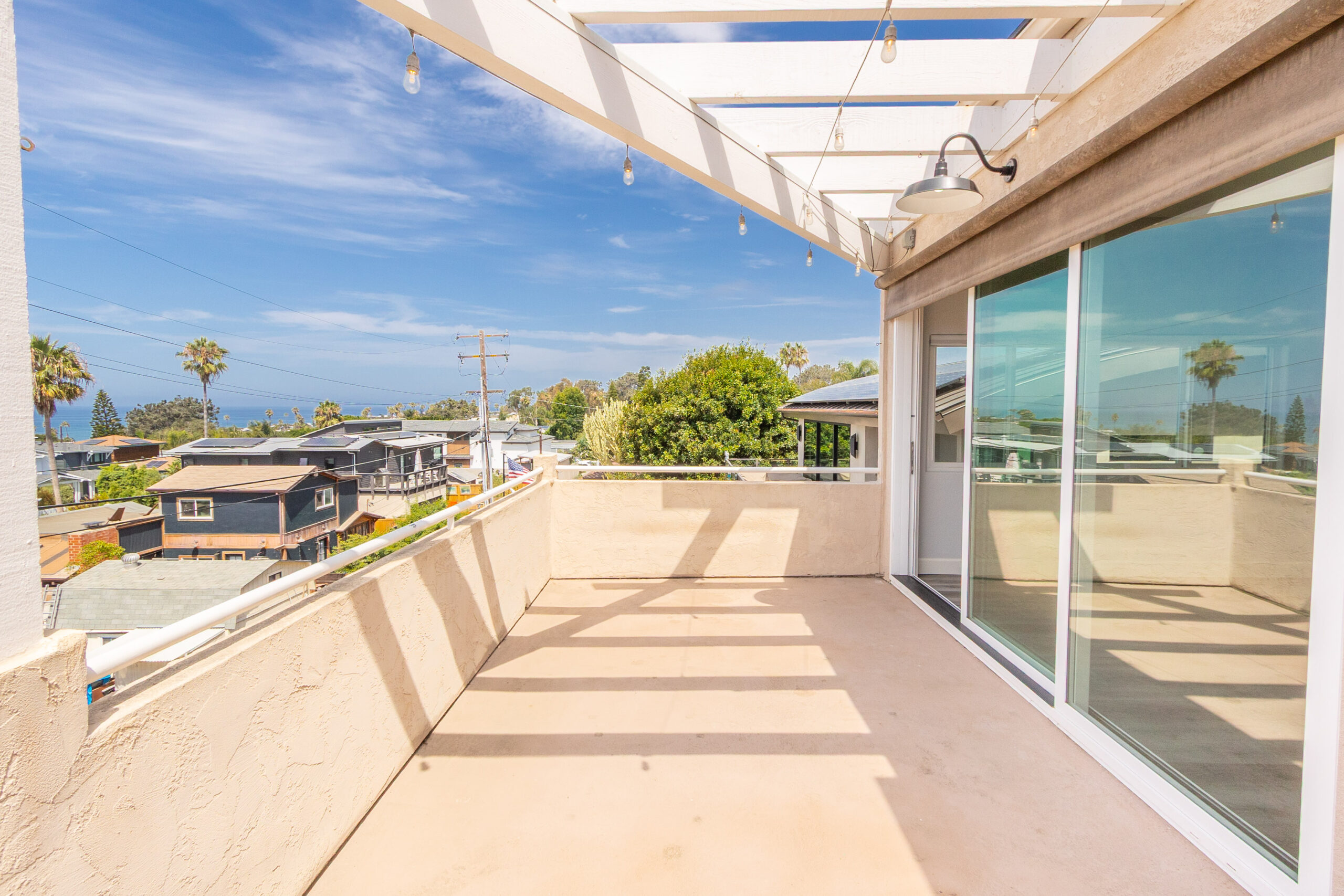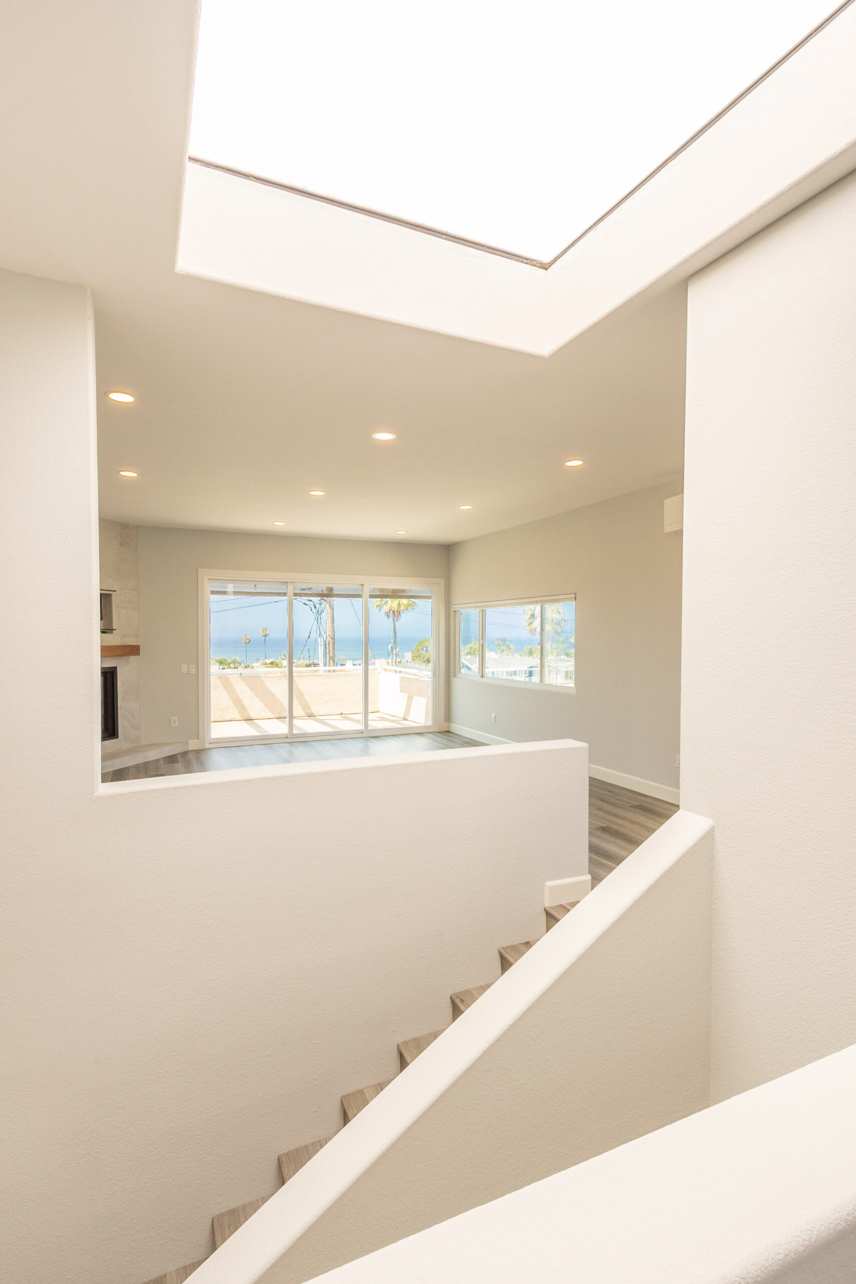 This beautifully remodeled 3 bedroom, 2.5 bath home was designed to make the most of Encinitas living, with sweeping ocean views from both the main living area and the primary suite balcony. The top level is bright and inviting, with an open living and dining space anchored by a cozy fireplace and a dramatic skylight that floods the home with natural light. Sliding glass doors open to a spacious deck, perfect for morning coffee, sunset cocktails, or entertaining with a backdrop of panoramic coastal vistas. The kitchen will impress any home chef, featuring stainless steel appliances, a 5-burner gas cooktop, custom cabinetry, beautiful stone countertops, and a breakfast bar. An oversized pantry room with additional counter space, storage, and a wine fridge makes entertaining a breeze. On the entry level, the primary suite offers a true retreat with a spa-inspired bathroom, dual sinks, soaking tub, separate shower, and generous closet space. On the lower level, you'll find two additional bedrooms, a full bathroom and access to a private enclosed patio, creating a comfortable and versatile living space. Additional highlights include a two-car attached garage with full-size washer and dryer.
