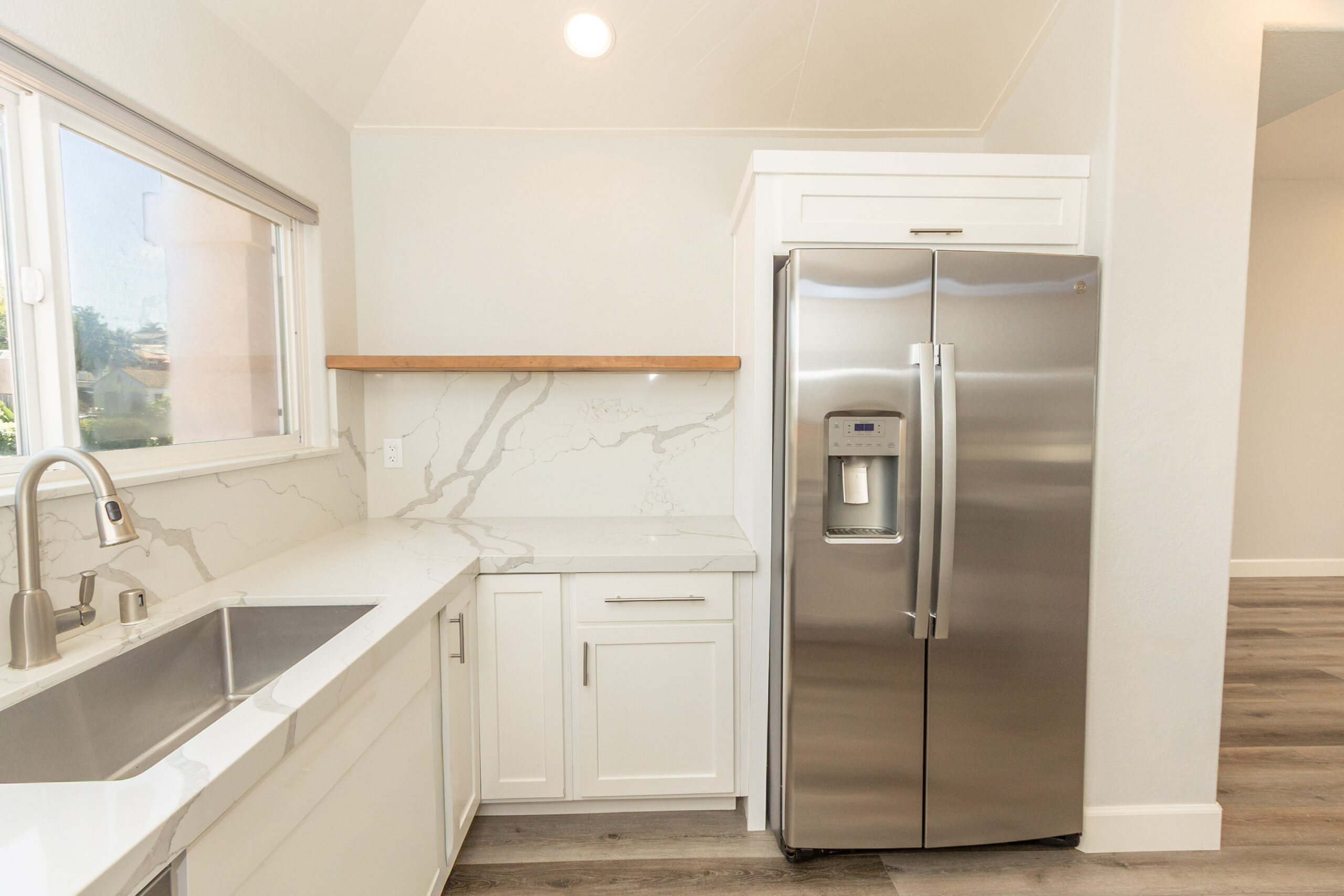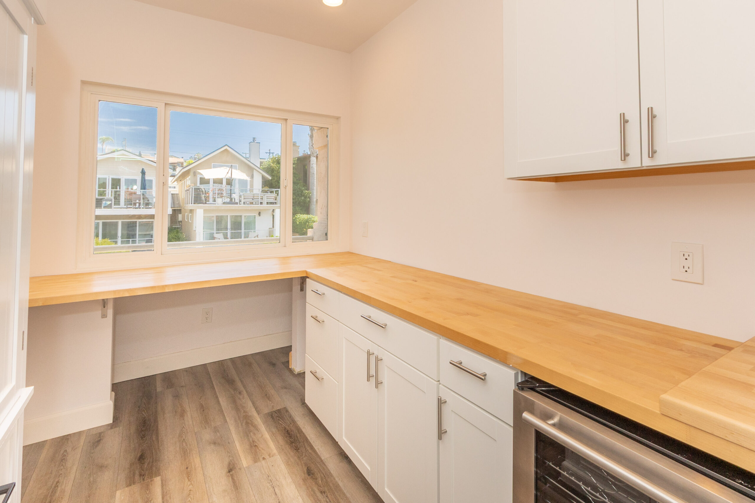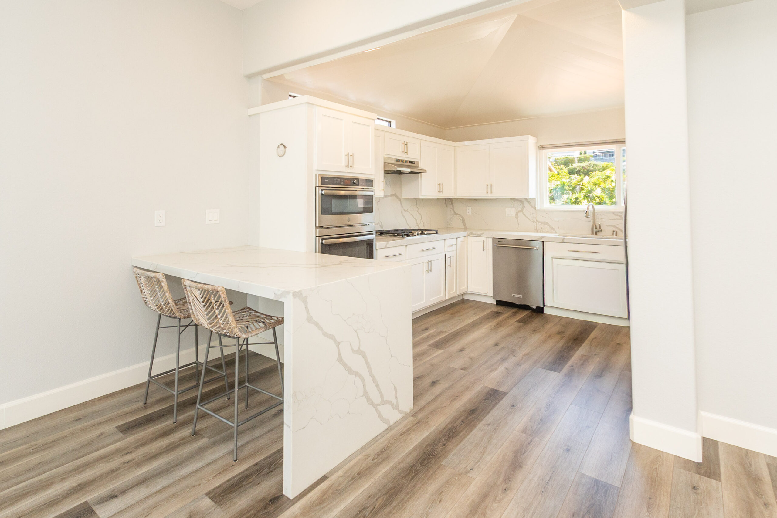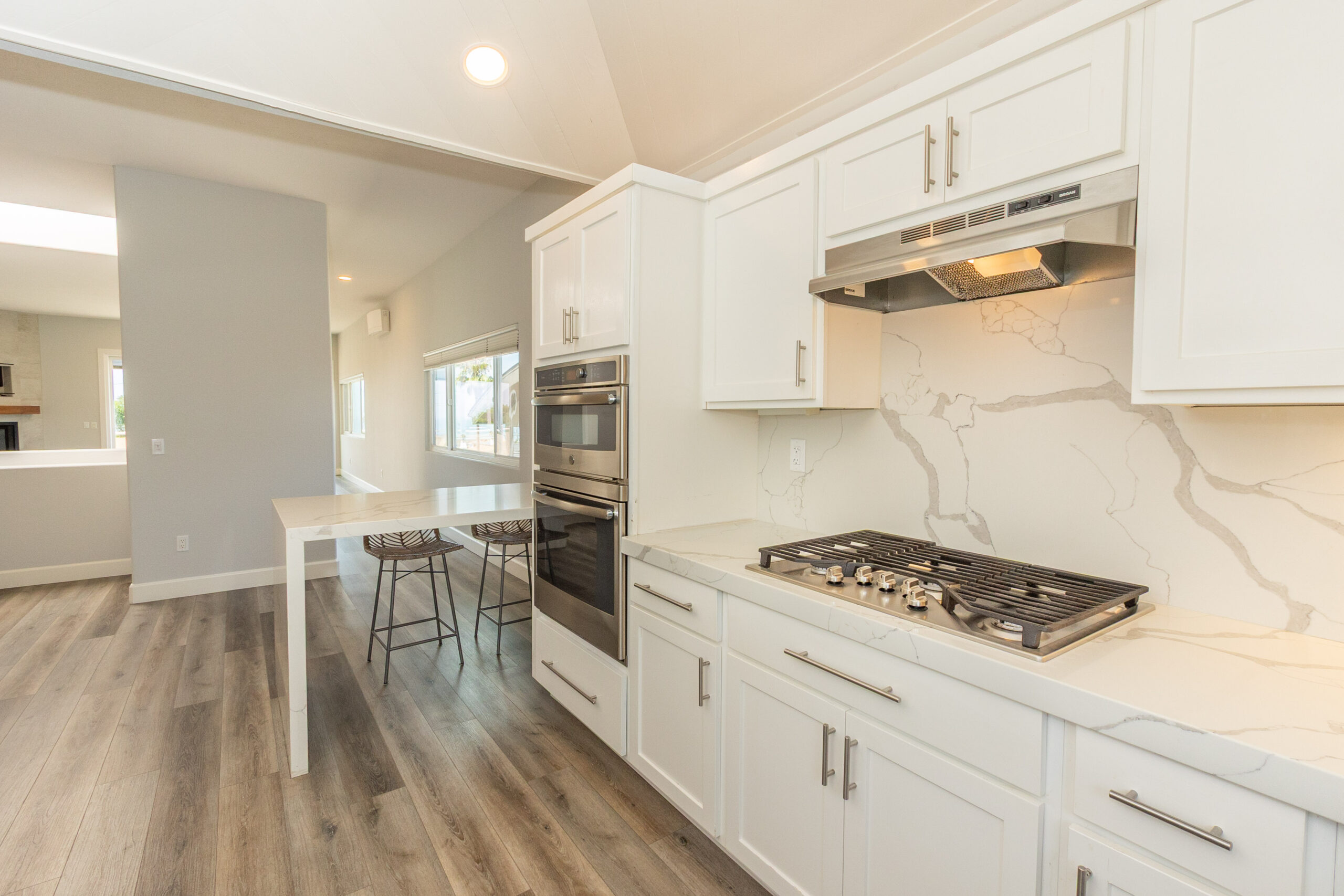 This beautifully remodeled 3 bedroom, 2.5 bath home was designed to make the most of Encinitas living, with sweeping ocean views from both the main living area and the primary suite balcony. The top level is bright and inviting, with an open living and dining space anchored by a cozy fireplace and a dramatic skylight that floods the home with natural light. Sliding glass doors open to a spacious deck, perfect for morning coffee, sunset cocktails, or entertaining with a backdrop of panoramic coastal vistas. The kitchen will impress any home chef, featuring stainless steel appliances, a 5-burner gas cooktop, custom cabinetry, beautiful stone countertops, and a breakfast bar. An oversized pantry room with additional counter space, storage, and a wine fridge makes entertaining a breeze. On the entry level, the primary suite offers a true retreat with a spa-inspired bathroom, dual sinks, soaking tub, separate shower, and generous closet space. On the lower level, you'll find two additional bedrooms, a full bathroom and access to a private enclosed patio, creating a comfortable and versatile living space. Additional highlights include a two-car attached garage with full-size washer and dryer.