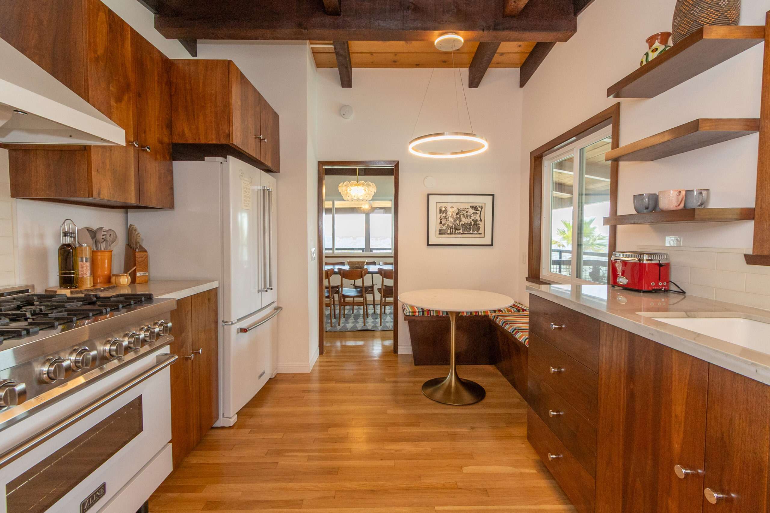 The spacious kitchen is both stylish and functional, complete with custom wood cabinetry, open shelving, top quality white appliances, a cozy breakfast nook, and a spacious pantry.