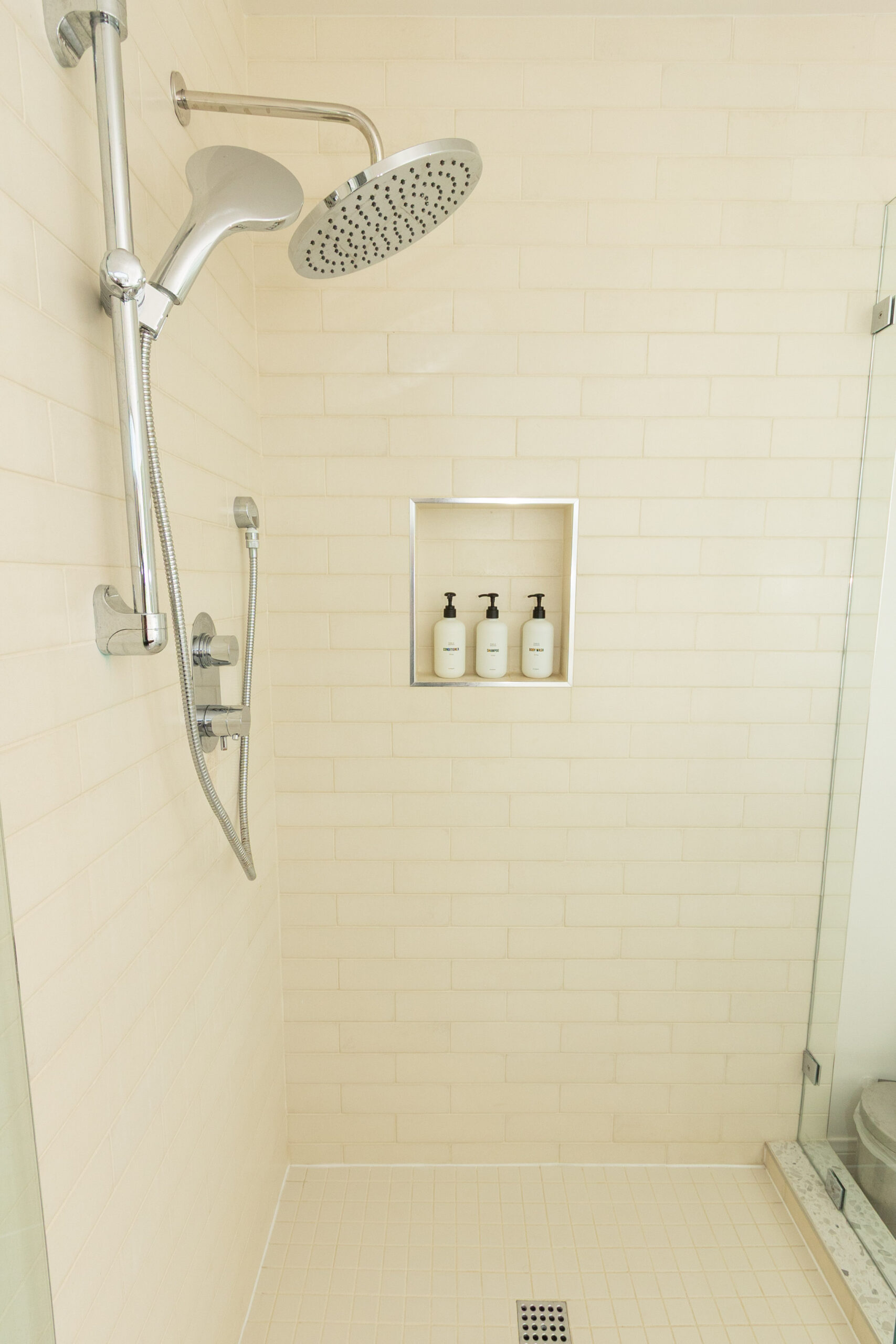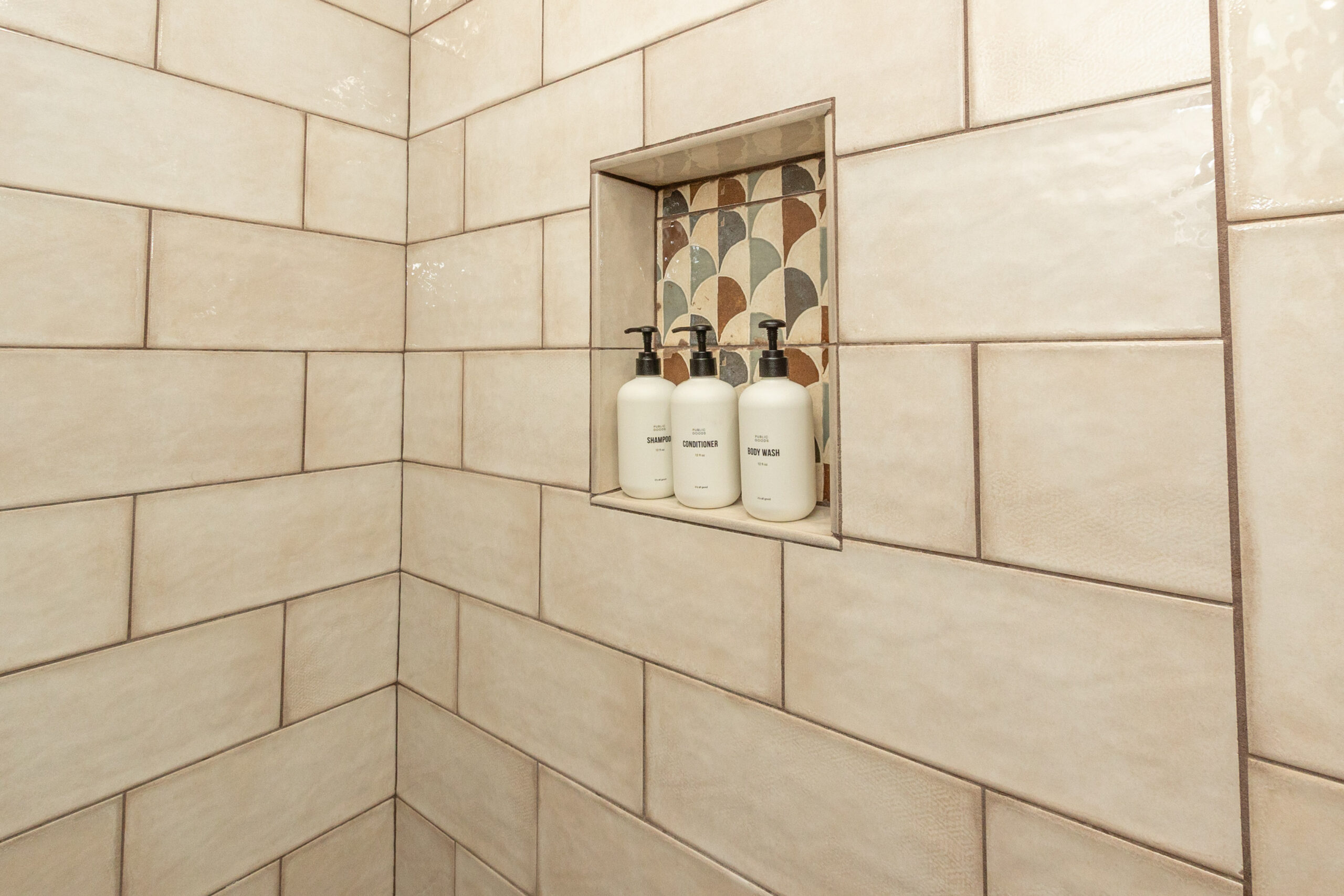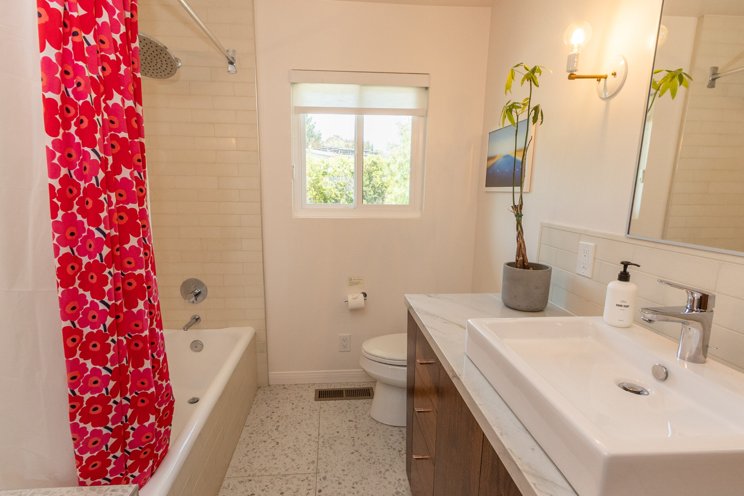 The primary suite offers generous closet space and a beautifully designed en-suite bathroom with double sinks, terrazzo flooring, marble countertops, and custom cabinetry. The guest bath continues with the same aesthetic and includes a beautifully tiled soaking tub. Conveniently located in the hallway closet is a washer and dryer.