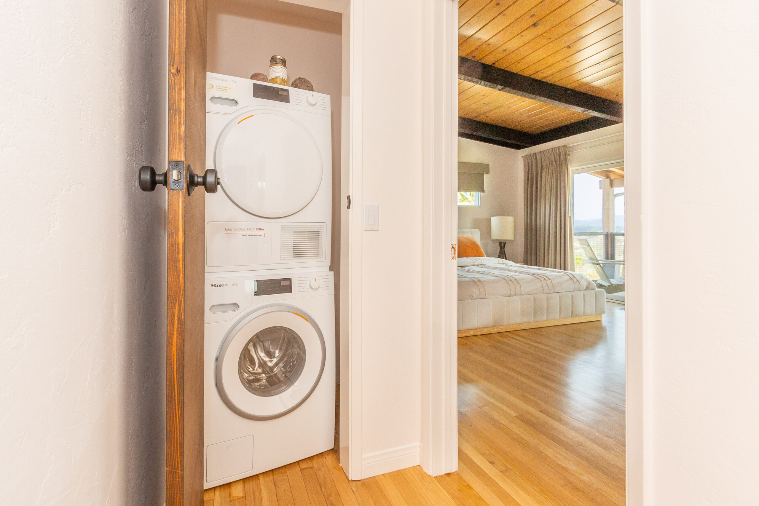 The separate upper level main residence features 2 spacious bedrooms and 2 bathrooms. The living room, dining area and primary suite are perfectly positioned to capture the views, opening to a sweeping wraparound deck that creates a seamless indoor-outdoor feel. Inside, you’ll find wood flooring, exposed beam ceilings, and timeless mid century details throughout.