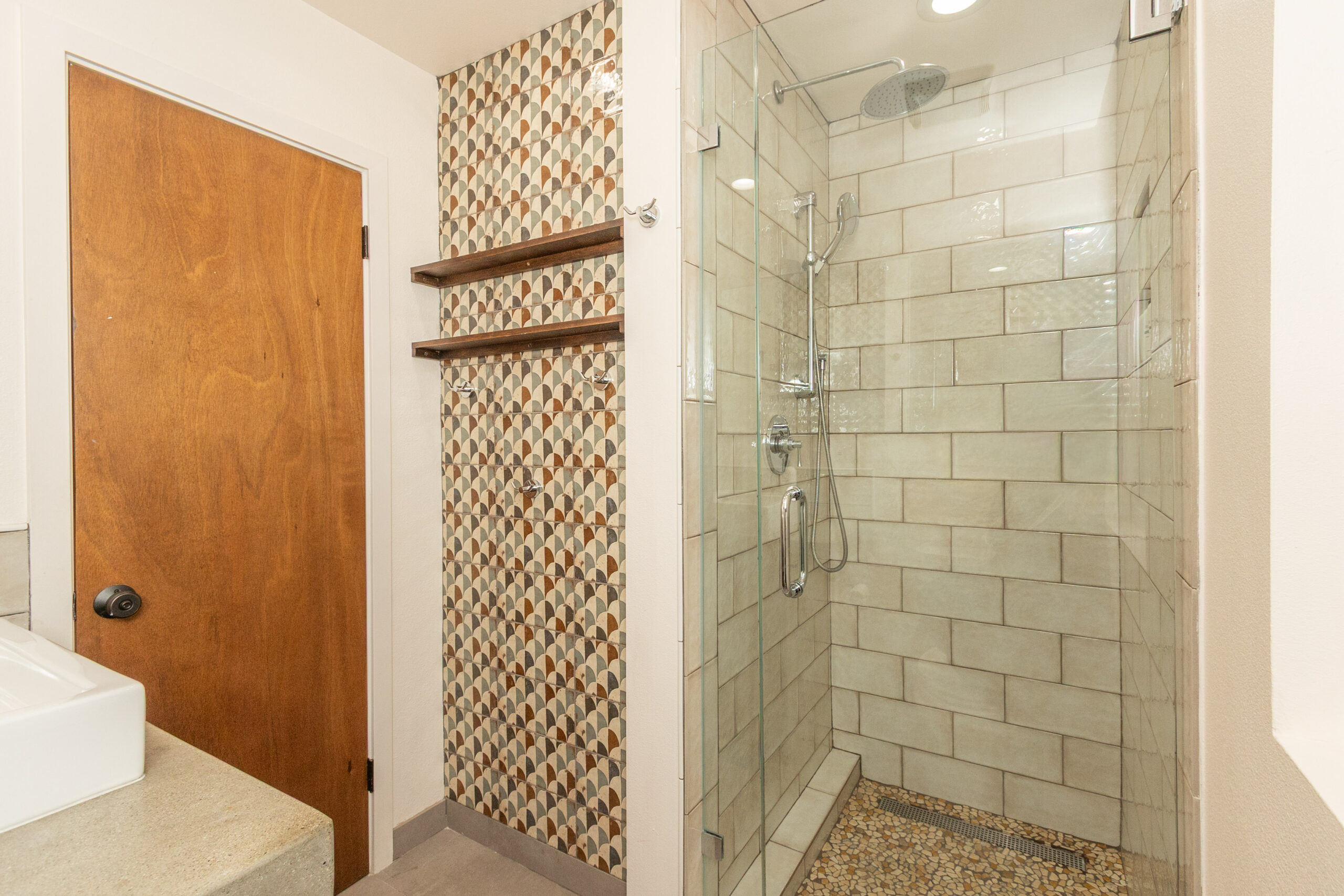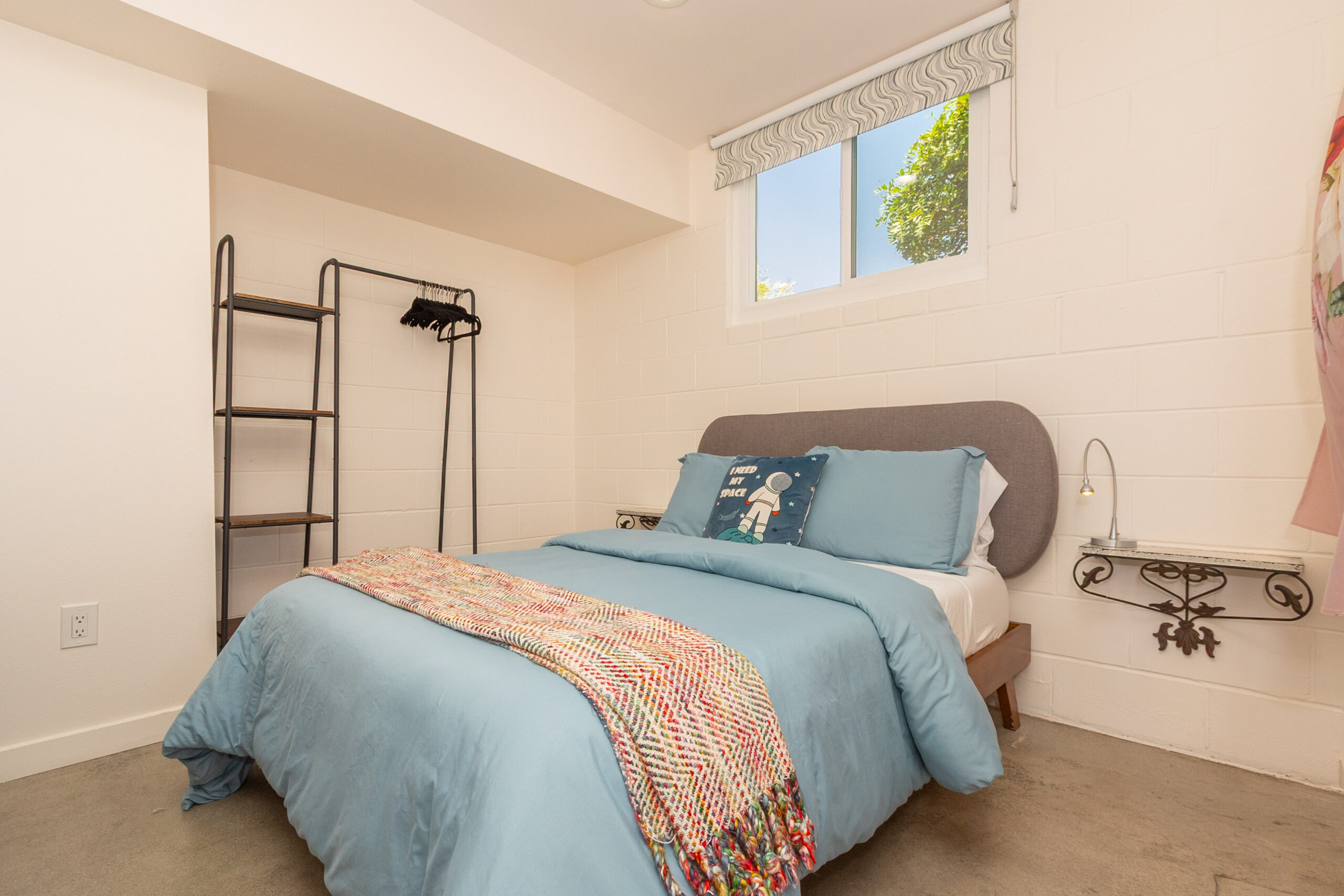 With the separate lower space you’ll find two bedrooms and one full bath, along with a space that feels fresh and modern with polished concrete floors and warm wood accents which create a cool, loft-like atmosphere. Two oversized garage style doors roll open to flood the area with natural light and fresh air, creating a seamless connection to the outdoors. The kitchen is both stylish and functional, featuring stainless steel appliances, concrete countertops, custom tile work, open shelving, and generous pantry storage. For added convenience, the lower level includes its own washer and dryer.