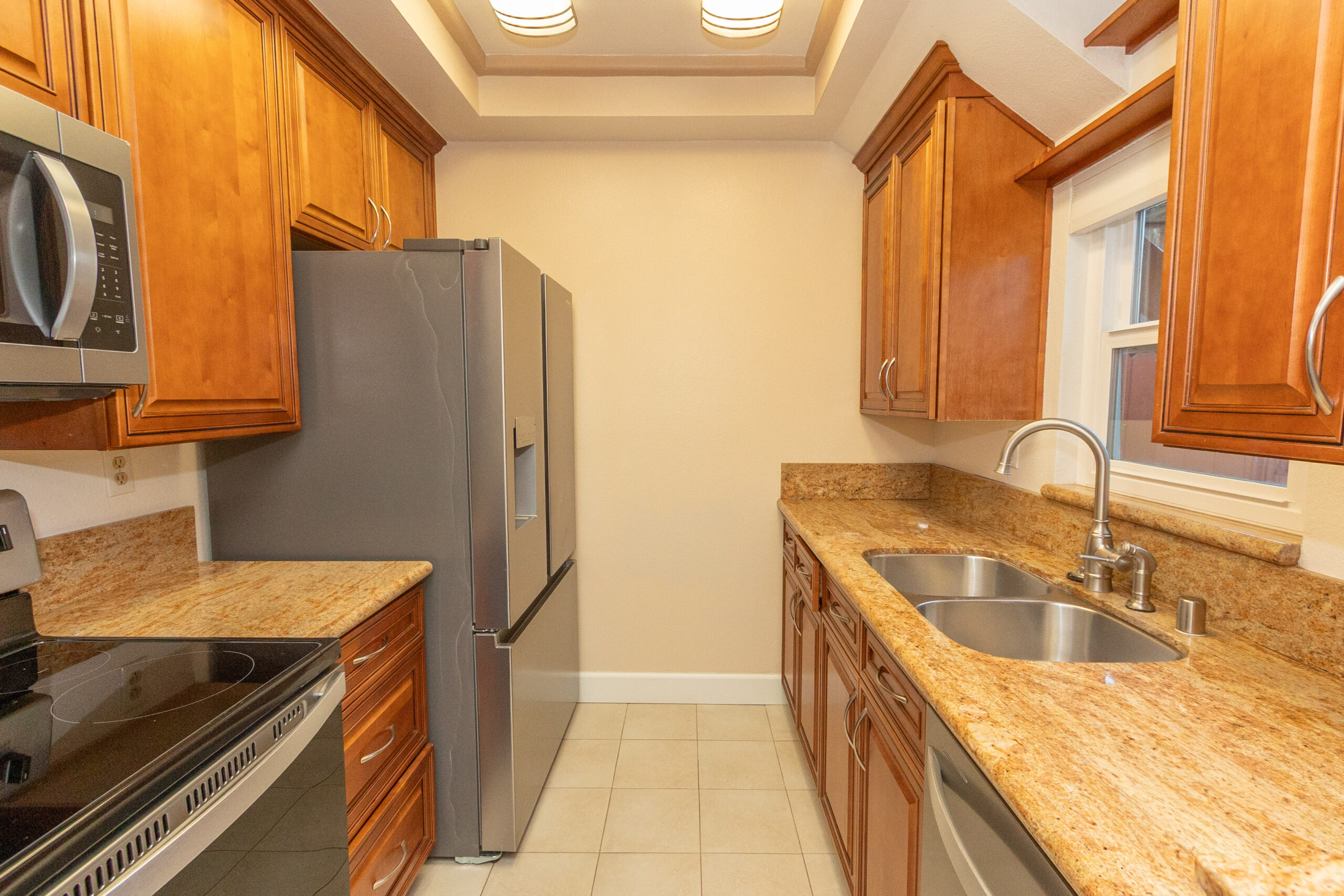 The upgraded kitchen offers granite countertops, abundant cabinet space, and new stainless steel appliances. The primary suite includes a generous closet and a bathroom with a new vanity and a stunning granite-tiled shower. Enjoy a spacious private patio, accessible from both bedrooms. The second bathroom off the hallway has also been refreshed with a granite top vanity, tub, and updated fixtures.